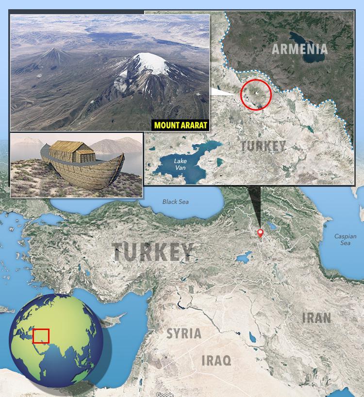 根据圣经里写道,诺亚的方舟在150天后停在一个叫做亚拉腊山的山上,而从此之后很多人一直都在寻找这个方舟。根据Andrew Snelling博士表示:“大部分的人都在土耳其北部的亚拉腊山找方舟,圣经上这样写的话,应该是这座山在淹水前就已经存在。那时的大淹水应该让地就很多地形都改变才对,所以说不定现代的亚拉腊山也跟以前的不太一样,不过那座山的附近应该可以找到一些线索才对。”