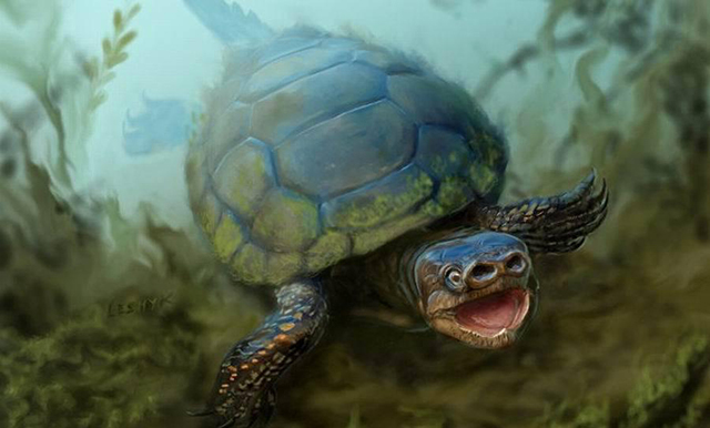 远古猪鼻龟:美国犹他州科学家一项最新研究显示,挖掘发现一种7600万年前的灭绝新物种,它的鼻子非常像猪,长着两个鼻孔,与其它只有一个鼻孔的龟完全不同,猪鼻龟体长0.7米,生活在白垩纪时期,被称为迄今世界上最奇特的龟类。