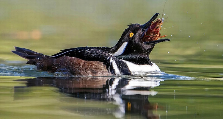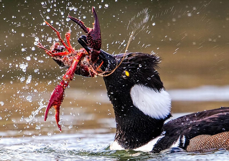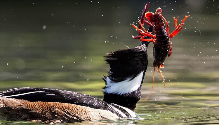美国摄影师安德鲁·李(Andrew Lee)十分欣赏褐秋沙鸭的雄姿。在得知有数只褐秋沙鸭在加利福尼亚州富勒顿市一个大池塘中栖息时,他便即刻前往,并抓拍到“沙鸭大战小龙虾”的精彩画面。