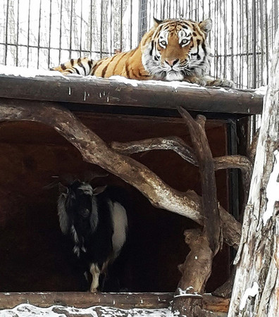 俄罗斯海参威的普立莫斯基野生动物园(Primorsky safari park)的东北虎和山羊成为好朋友的故事成为佳话,然而这对好友最近被分开了,原因是山羊帖木儿(Тимуру,Timur)在这同居的8周就“幸福肥”胖了45磅(20公斤),造成健康问题,也预防老虎被发情母虎引起兽性,翻脸不认羊。