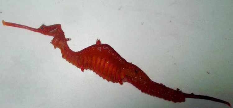 红色海龙:这种最新发现的海龙物种,全身红色,学名是Phyllopteryx dewysea,它是迄今发现的第三种已知海龙物种,也是150年以来首次发现的海龙新物种,科学家认为,它的体色之所以全红,与其它海龙物种相差很大,是由于它们栖息在深海,有助于它们有效地隐藏在海底世界之中。