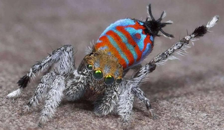 澳大利亚孔雀蜘蛛:这是澳大利亚境内发现的一种孔雀蜘蛛,它的学名是Maratus jactatus,体形较小,仅4.5毫米长,雌性体形略大一些,达到5.3毫米长。拉丁语中这种蜘蛛叫做“摇滚蜘蛛”,它能够非常快速地侧身滚动,雄蛛不断地向雌蛛表达求偶炫耀。
