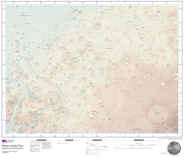 英国地形测量局依据美国太空总署(NASA)的数据资料,绘制出第一张火星地图。这张地图所画的位置是在斯基亚帕雷利撞击坑(Schiaparelli)附近,涵盖范围宽3672公里、长2721公里,是火星面积的7%。