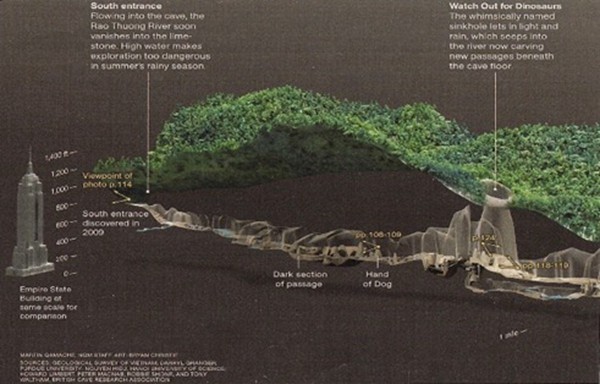 位于越南广平省峰牙“己榜国家公园”内的山水洞,宽170公尺,高约200公尺,洞穴整体长度目前约5.5公里,但由于洞穴本体是石灰岩,因此继续“维持像目前这样、被流水不断侵袭切割”的状态下去,是有可能越来越深的!