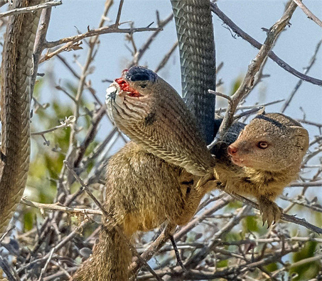 据英国《每日邮报》2月17日报道,摄影师伊兰娜·伊拉斯谟(Elana Erasmus)在纳米比亚国家公园里拍到了一条非洲树蛇与猫鼬大战、最后竟惨败的场景。