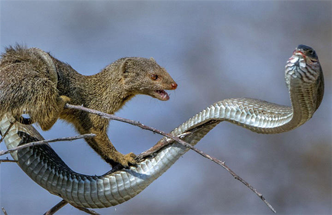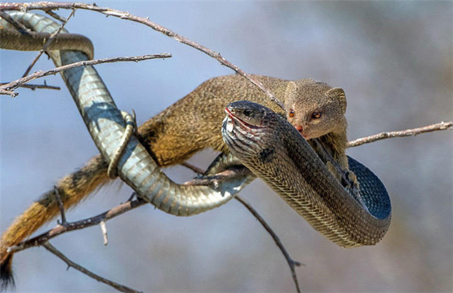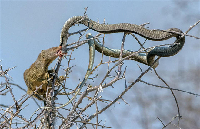 树蛇有所察觉,蠕动了起来,试图甩掉猫鼬。