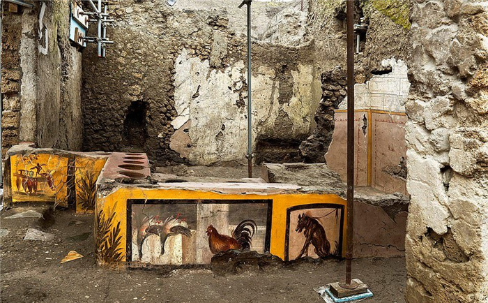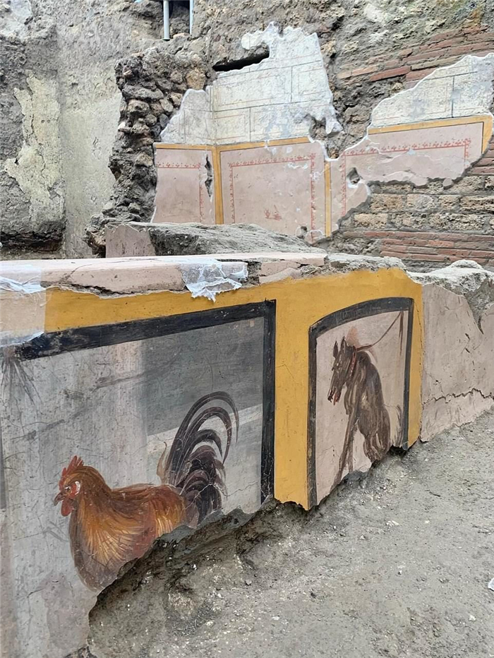 根据《每日邮报》报道,这间餐厅其实在2019年就部分被挖出,之后经过长时间的挖掘,发现了一个的Z字形柜台,上面有许多洞,孔洞上有许多盛放食物的深盘,与现在沙拉吧的盘子略有不同。其实在庞贝城中已经有80间快餐餐厅出土,不过这次的热食热饮餐厅倒是第一次被发现,餐厅一旁还能发现鸡、鸭等动物的壁画,可见当年就有招牌广告或是菜单的概念。