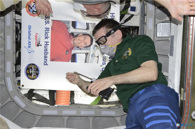 对接完成,这是宇航员进入天鹅座飞船的加压舱内搬取货物。后方的照片为2003年罹难的哥伦比亚号航天飞机指令长里克·道格拉斯·赫斯本德(Richard Douglas Husband),这艘天鹅座飞船为了纪念他而被命名为“里克·赫斯本德(Rick Husband)号”。在火星上,同样有一座以他命名的山峰--赫斯本德山。