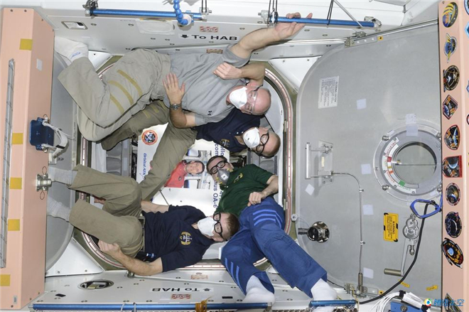这是他们后来不戴口罩的样子,而且是驻守空间站的6名宇航员全家福,他们是怎么做到自拍的呢?其实很简单,把相机定好时间让它飘在舱内拍就行了。