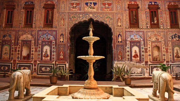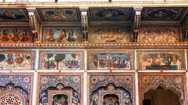 灵感来自于17世纪拉齐普特族国王的斋蒲尔琥珀堡(Amer Fort)中的赭石壁画,商人让能工巧匠在宅邸的每一寸墙上都描绘上错综复杂的壁画——包括外墙、内饰、天花板甚至拱门和屋檐下的空间。描绘的壁画中最常见的图案来源古印度史诗《摩诃婆罗多》和《罗摩衍那》——以及大量的装饰花卉设计和图案。