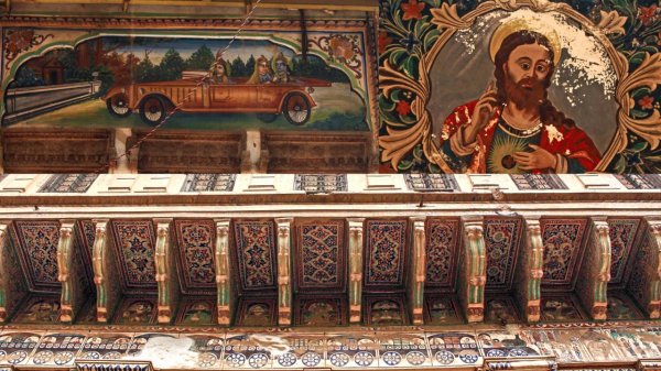 到了20世纪初,壁画开始描绘欧洲影响和现代进步——展现经常旅行的商人所看到的大城市。在一些罕见的情况下,画家会被送出去观察和重现场景。除了传统图案,壁画中还有了伊丽莎白女王、耶稣、小天使、蒸汽机和老式留声机,以及怪诞的与现代发明的混合创造,如印度教神配司机(如图)。