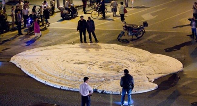 神秘渗出物。2013年中国南京一条街道上,散发臭味的不明异物突然从裂缝中渗出,之后异物似乎慢慢地退回去...