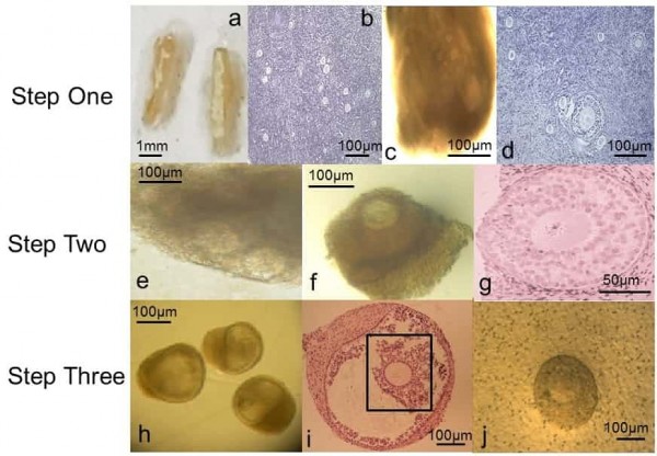 科学家将卵巢组织取出,在体外独立培养为成熟卵子的各阶段照。