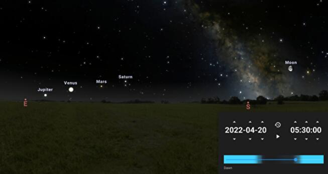 4月北半球天空,人们将会在地平线上不远处看到木星、金星、火星、土星和月亮排成一条直线的罕见景观。