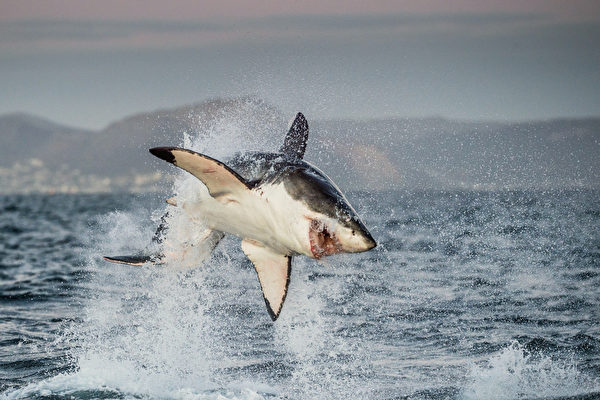 在南非外海,有一条大白鲨在捕食时跃出海面15英尺(4.6米)。这个腾飞在半空中的画面被南非鲨鱼专家暨摄影师法洛...