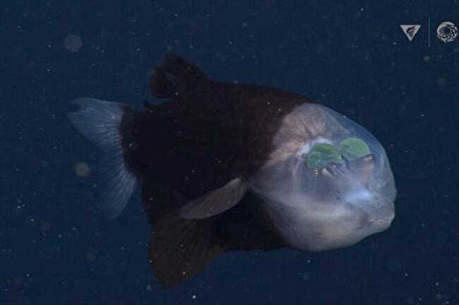 美国科学家日前在加州深海捕捉到一种外形奇特的鱼,其头部呈现透明状,而两颗大大的绿色眼珠在头部透明的保护罩下清晰...