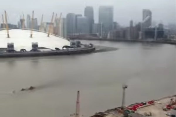 从镜头中可见一神秘庞然大物在泰晤士河“游泳” 。