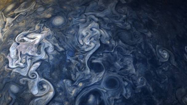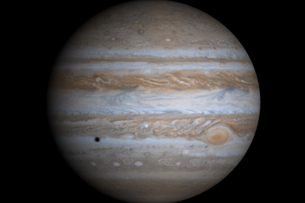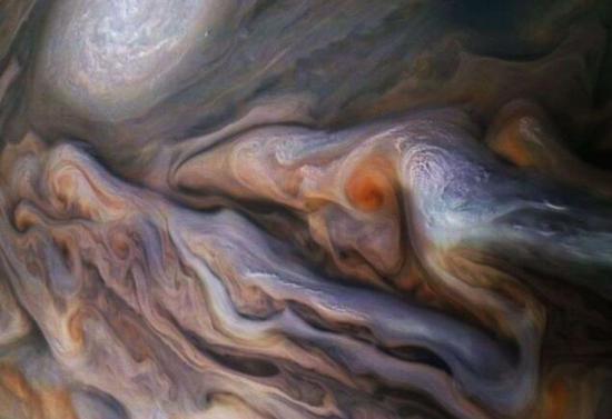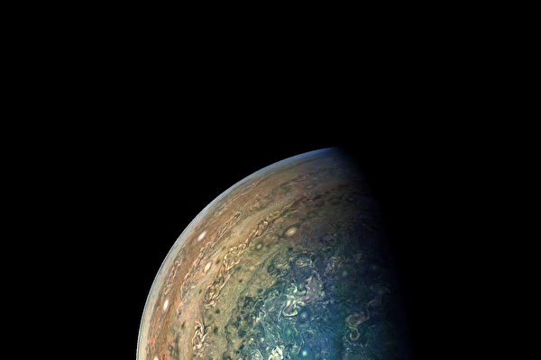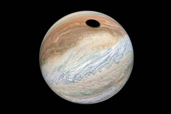 在这张照片中,木星宛若隐藏在夜色中的异色瞳仁,令人感觉有一种若隐若现的神秘绚丽色彩。(NASA)...