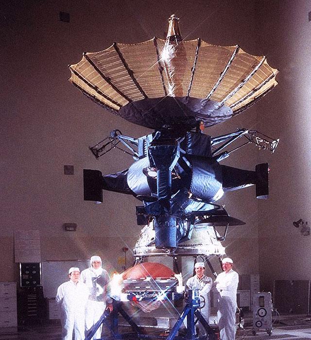发射前的伽利略号。伽利略号是人类第一颗木星人造卫星,因1986年挑战者号航天飞机失事推迟两年发射...