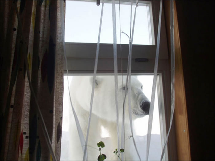 北极熊因为主食受到人类的扑杀,开始会到当地居民家中找食物