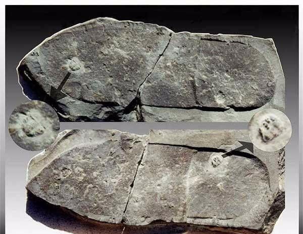 图一、三叶虫上的鞋印(图中左右圆圈中是放大后的三叶虫)
