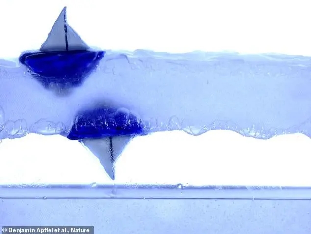 一组科学家造出一层漂浮在空气中的液体,里面放入两艘微型玩具船,一艘正常浮在液体表面之上,另一艘却可以倒过来浮在...