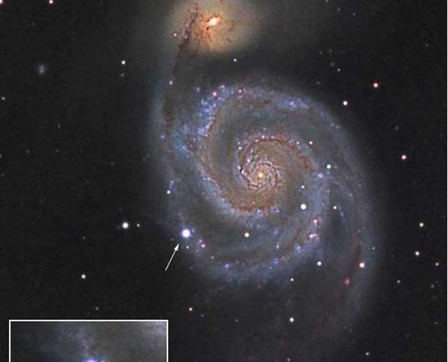 编号为NGC5195的星系(方框内),黑洞发生“消化不良”喷射出大量物质。 离地球两千多万光年的超大质量黑洞...