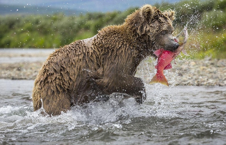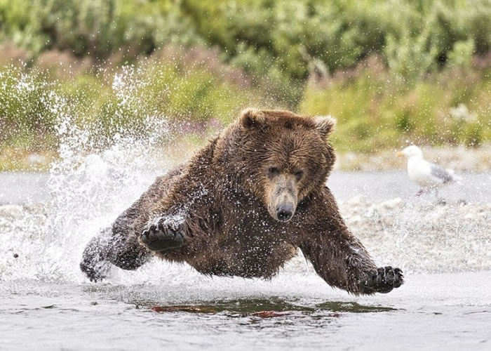 灰熊似是在水面上滑翔。 灰熊轻盈地飞身跃进河涧中捕鱼。 灰熊常见于北美洲,它们体型庞大,一向予人敦...