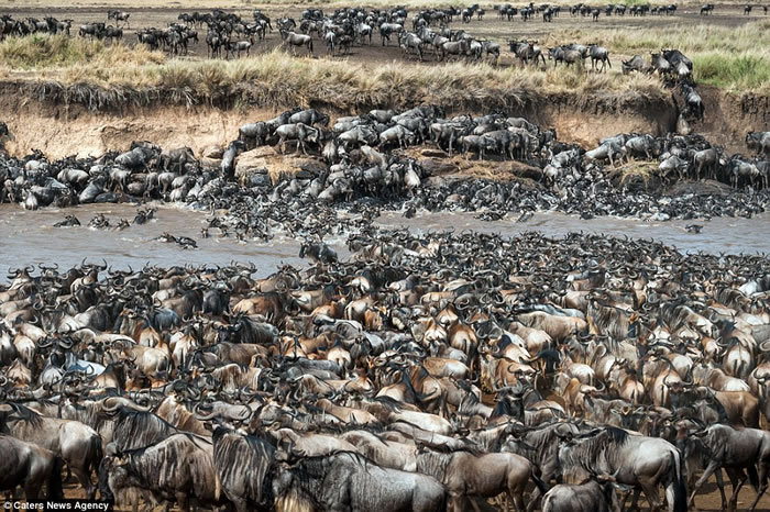 肯尼亚马赛马拉8万牛羚大迁徙,两斑马误闯入群你能不能找到?