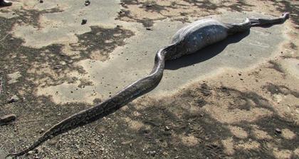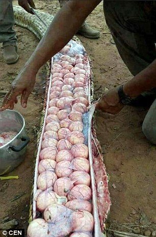 当地的村民怀疑一条巨大的蟒蛇吞吃了它们的牲口,但是把它劈开以后才发现,这货肚子里竟然装了几十只蛇蛋。