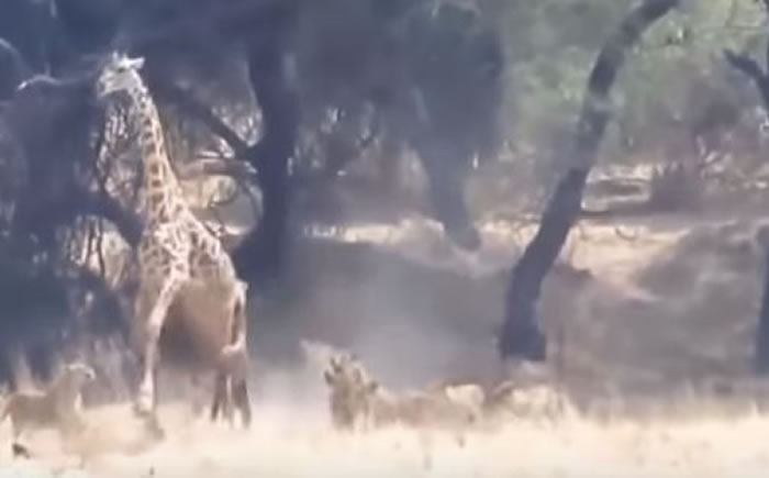 11头狮子围剿1头长颈鹿