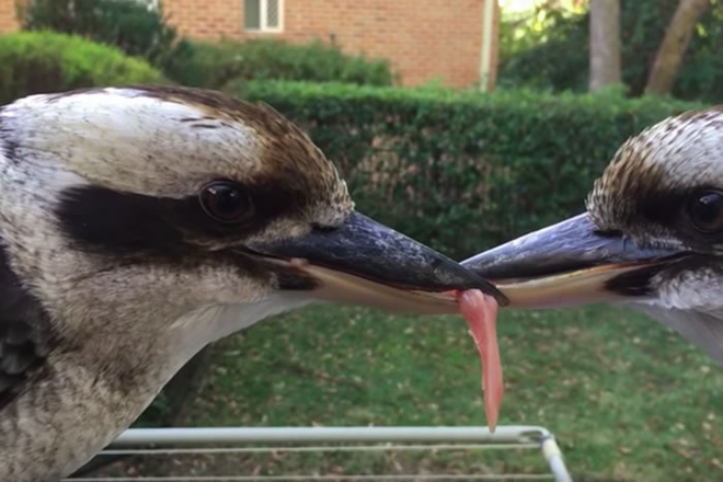 2只澳洲笑翠鸟嘴对嘴咬住一块肉僵持数小时 给另一块肉也不行