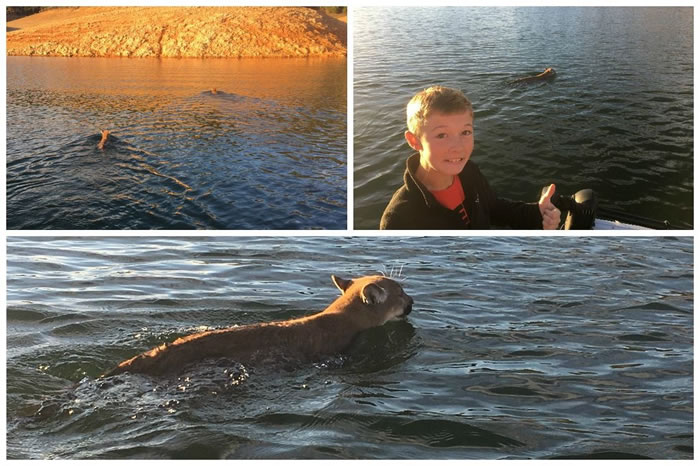 美国加州沙斯塔湖两只美洲狮游泳渡湖