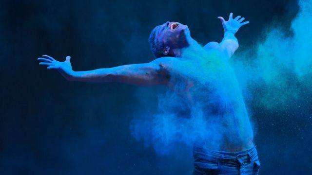 一名男子伸开双臂,全身沾满蓝色粉末(Credit: Henrik Sorensen/Getty ...