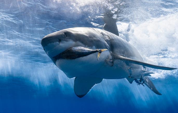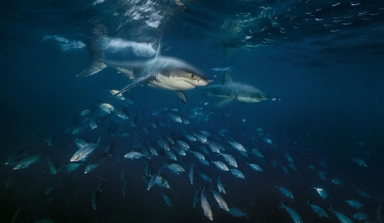 两只鲨鱼在尼普顿岛附近的海域找寻海豹。大白鲨不会群居,但也不完全独来独往,有时会在食物来源附近聚集。 Photo...