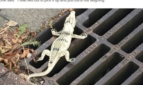 ▲“小鳄鱼”趴在水沟盖上晒“日光浴”。