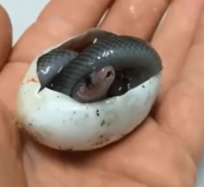 澳洲爬虫动物公园棕伊澳蛇宝宝刚破蛋壳就张开嘴巴打哈欠