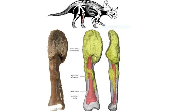 加拿大科学家近日发表论文称,他们在尖角龙(Centrosaurus)的一根严重畸形的腿骨化石中发现和诊断出骨肉...