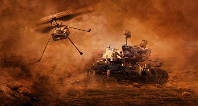 毅力号探测器拍到的火星尘卷风(图右上角)。(NASA/JPL-Caltech)